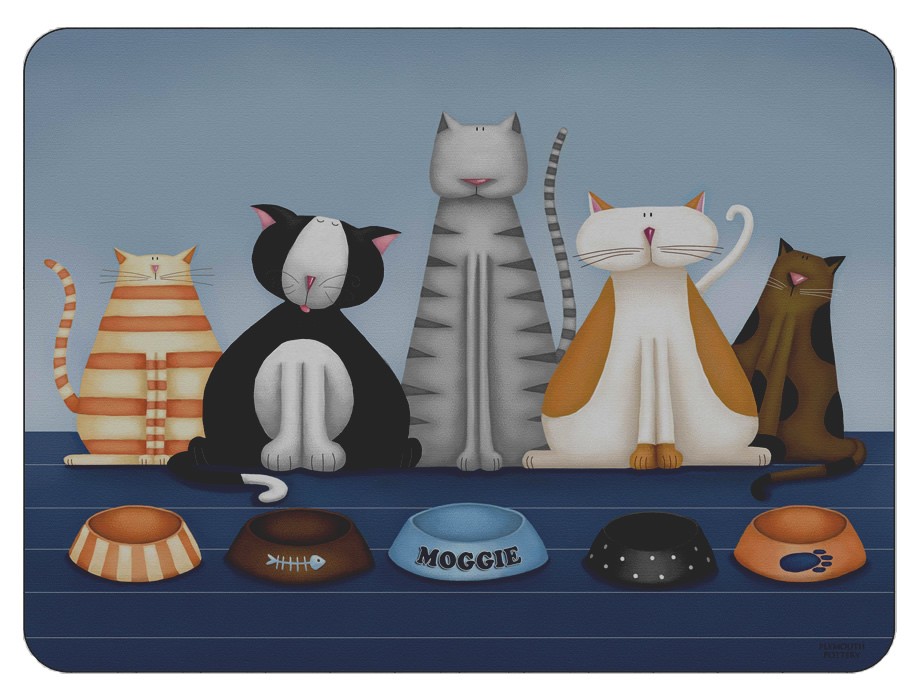 There is an enormous variety of designs and mats made from all sorts of diverse materials, such as melamine, corkbacked, slate, paper or woven vinyl and a spectrum of designs ranging from plain, to floral and animal themes. All of which will serve their purpose of protecting your furniture, so why choose the Plymouth Pottery Hungry Cats placemats?